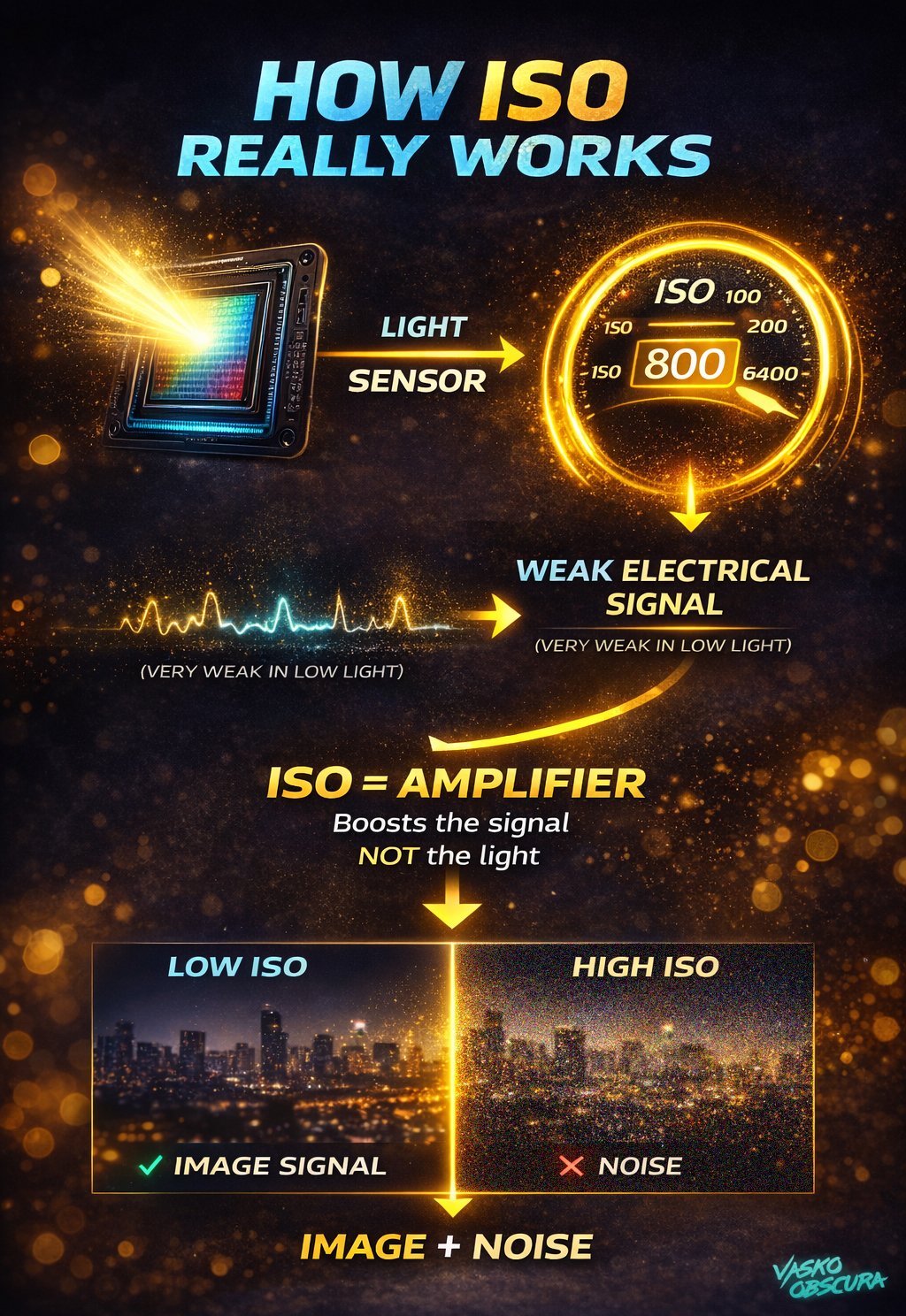 The problem is that this signal also contains random electronic interference, called noise. When you increase ISO, you amplify both the useful image signal and the unwanted noise at the same time. This is why higher ISO images result in grainy or noisy photos. There you go now you know.